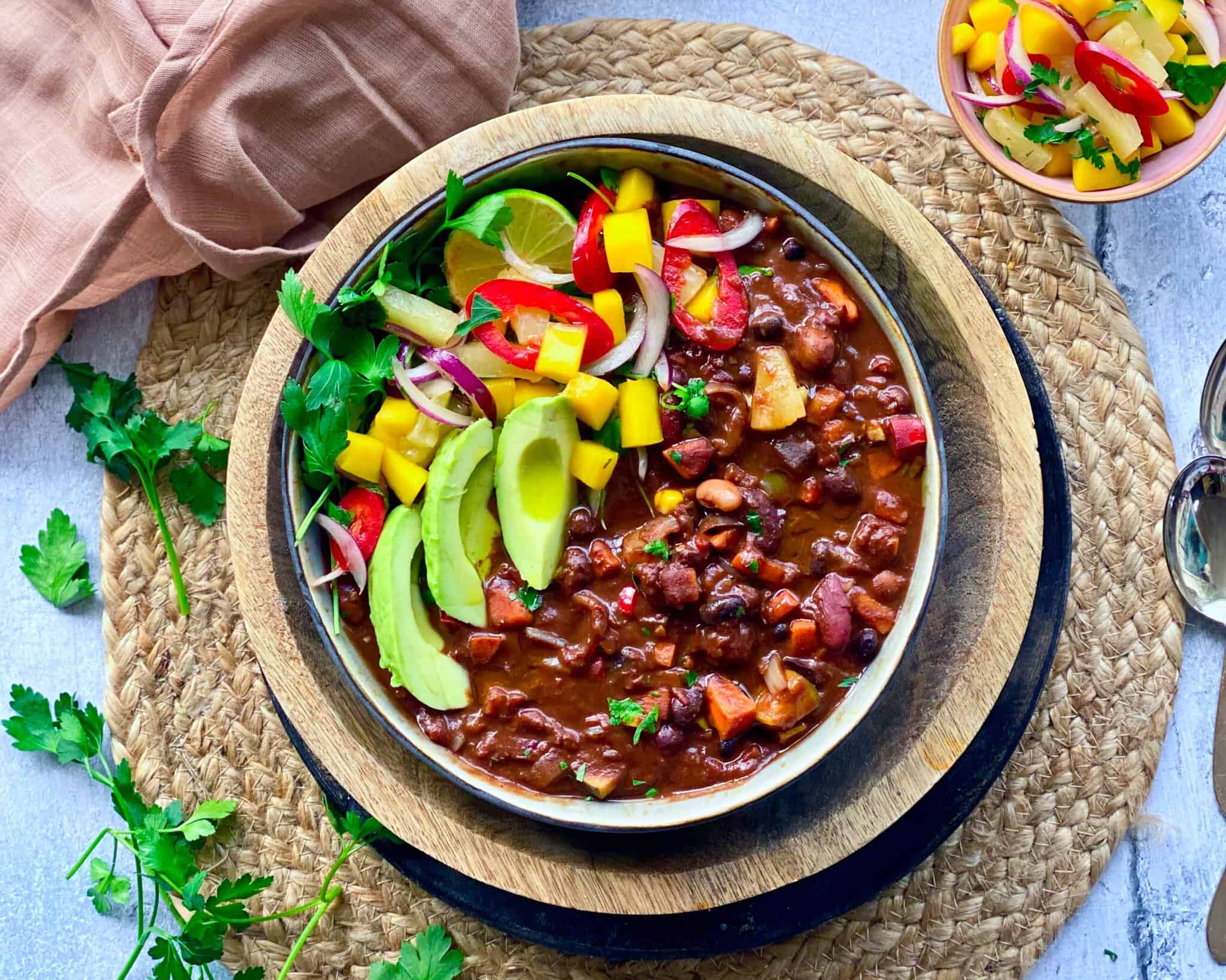 En skefuld creme fraiche på toppen gør chilien rund og blød, og jeg serverer næsten altid frisk koriander eller persille ved siden af, så alle selv kan drysse på. Det giver både farve og en grøn friskhed, der klæder retten. Når alt kommer på tallerkenen – ris, chili, salsa, avocado og creme fraiche – så føles retten både farverig, fyldig og tilfredsstillende på en måde, som jeg synes er helt perfekt efter en lang dag.
